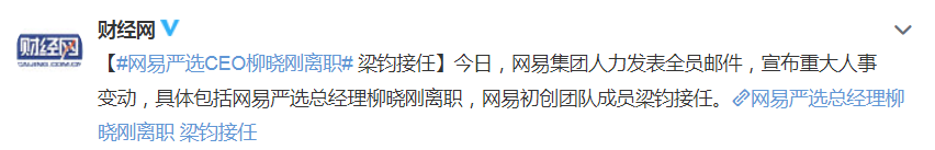 10月28日,網(wǎng)易集團(tuán)人力發(fā)表全員郵件,宣布重大人事變動,具體包括網(wǎng)易嚴(yán)選總經(jīng)理柳曉剛離職,網(wǎng)易初創(chuàng)團(tuán)隊(duì)成員梁鈞接任。