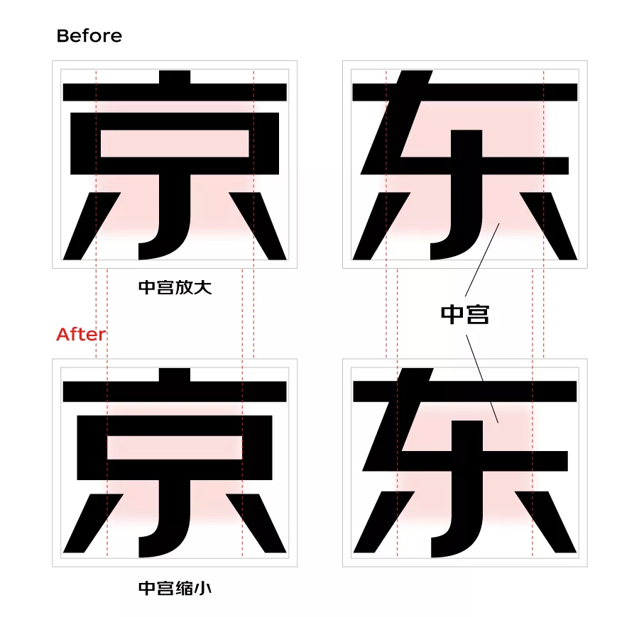 以“京東”二字為例,首先,我們對橫豎比例進行了調(diào)整。原來的“京東”二字,橫比較細豎比較粗,為了強化力量感的傳達,設(shè)計師反復(fù)思考、不斷嘗試,最后將字體橫豎比例定為了2:3。橫豎比例的改變,讓整個字的灰度變得穩(wěn)定、均勻,也顯得更穩(wěn)重、更有力量感。