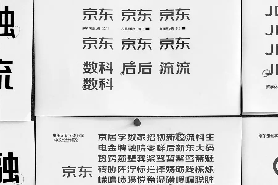 在設(shè)計過程中,為了讓字體達到更理想的視覺效果和氣質(zhì)特征,同時兼顧京東集團多場景的實際使用要求,承載起傳播京東文化的重任,在多種需求的平衡中,方正字庫設(shè)計團隊與京東設(shè)計團隊經(jīng)過了一段艱難的碰撞、磨合歷程。