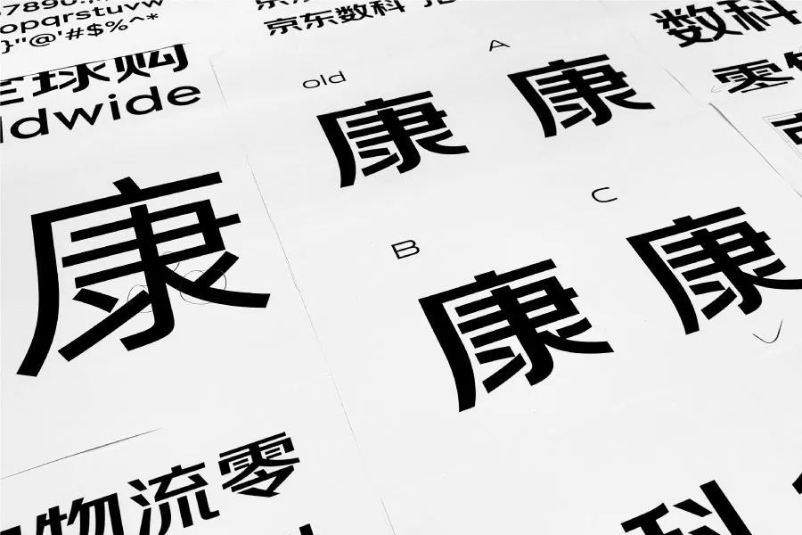 為了保持更好的文化承接性,京東朗正體的創(chuàng)意出發(fā)點是從京東原有Logo的“京東”二字演化而來。通過對原有筆畫的優(yōu)化調(diào)整和正負空間的再平衡,形成新字體的規(guī)則。