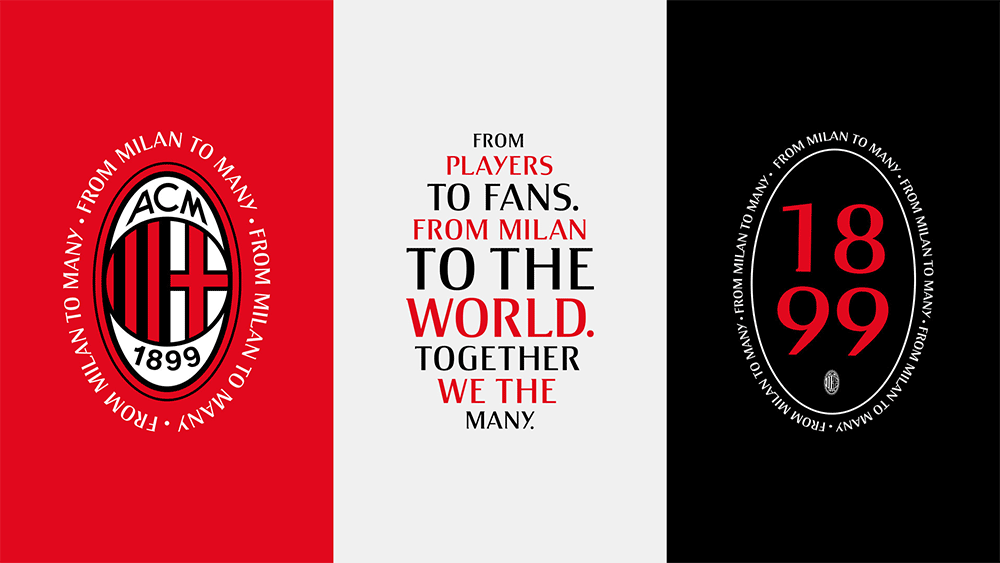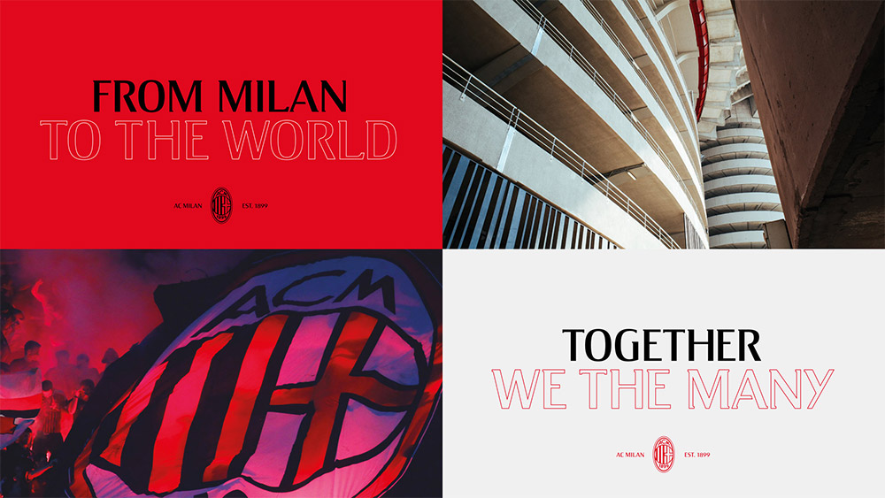 引入動(dòng)態(tài)的新字體,靈感來(lái)自與粉絲的共同心跳。從時(shí)尚、生活方式、品牌和意大利文化中汲取靈感,設(shè)計(jì)師創(chuàng)造了一個(gè)大膽而優(yōu)雅的印刷系統(tǒng)。它立即被識(shí)別,它捕捉了米蘭球迷對(duì)俱樂(lè)部的熱情。