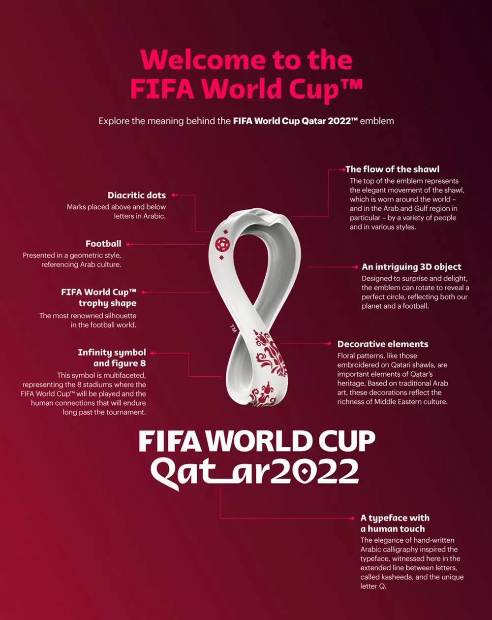 2022年卡塔爾世界杯會(huì)徽標(biāo)志性的弧線代表了沙漠沙丘的起伏,如同數(shù)字“8”的外觀不僅代表了承辦世界杯的8座球場(chǎng),同時(shí)也代表了符號(hào)“無(wú)限”,展現(xiàn)出萬(wàn)物相互關(guān)聯(lián)的本質(zhì)。與此同時(shí),這一標(biāo)識(shí)也與世界杯冠軍獎(jiǎng)杯——大力神杯的形狀呼應(yīng)。