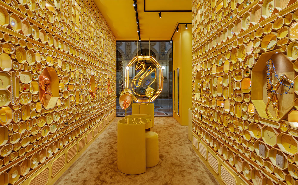 除了重新設計LOGO外,施華洛世奇還推出名為 「Instant Wonder」的門店。Instant Wonder 門店裝潢依然以八角形為靈感,如被金黃色「晶體」包覆的墻面,緊密排列的金黃色結構實為展示首飾、腕表、家居飾品及配件的櫥窗。從壁面「延伸」出的金屬雕塑,則成了演繹 Giovanna Engelbert 首發(fā)作品 Collection One的模特兒。