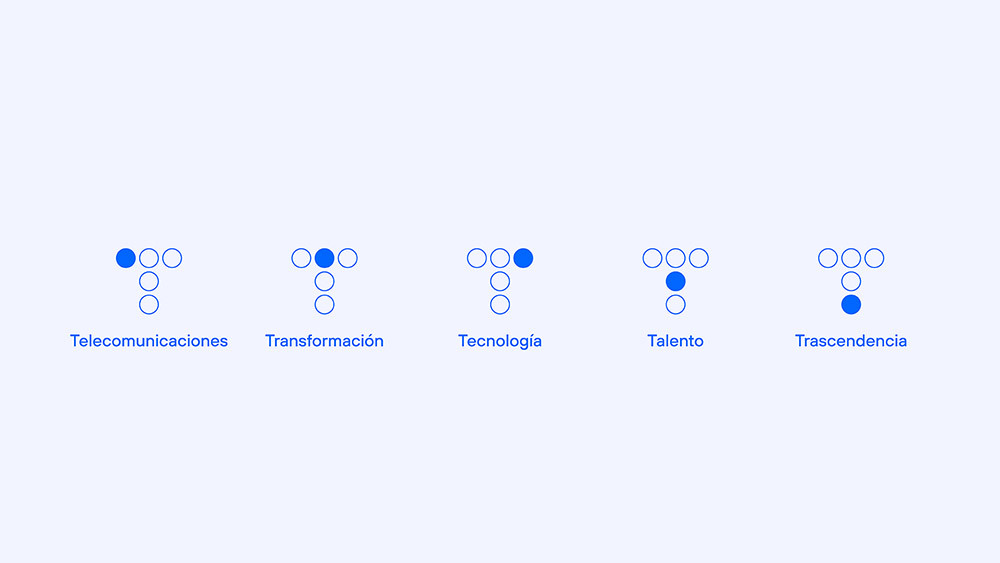 由五個圓點組成字母T,在致敬歷史的同時展示出更加精簡,敏捷和現(xiàn)代的視覺形象。五個圓點含義也比較豐富,其中代表了它將是該公司歷史上第五個LOGO,其次也代表了其五個支柱,即電信,技術(shù),轉(zhuǎn)型,人才和重要性。