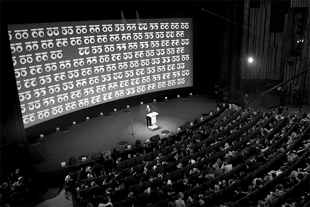 今年的數(shù)字55則化身一雙雙明亮的大眼睛,反映了重新聚在一起的快樂,也靈動的表現(xiàn)出了大家在看電影時以及對電影節(jié)的期待。