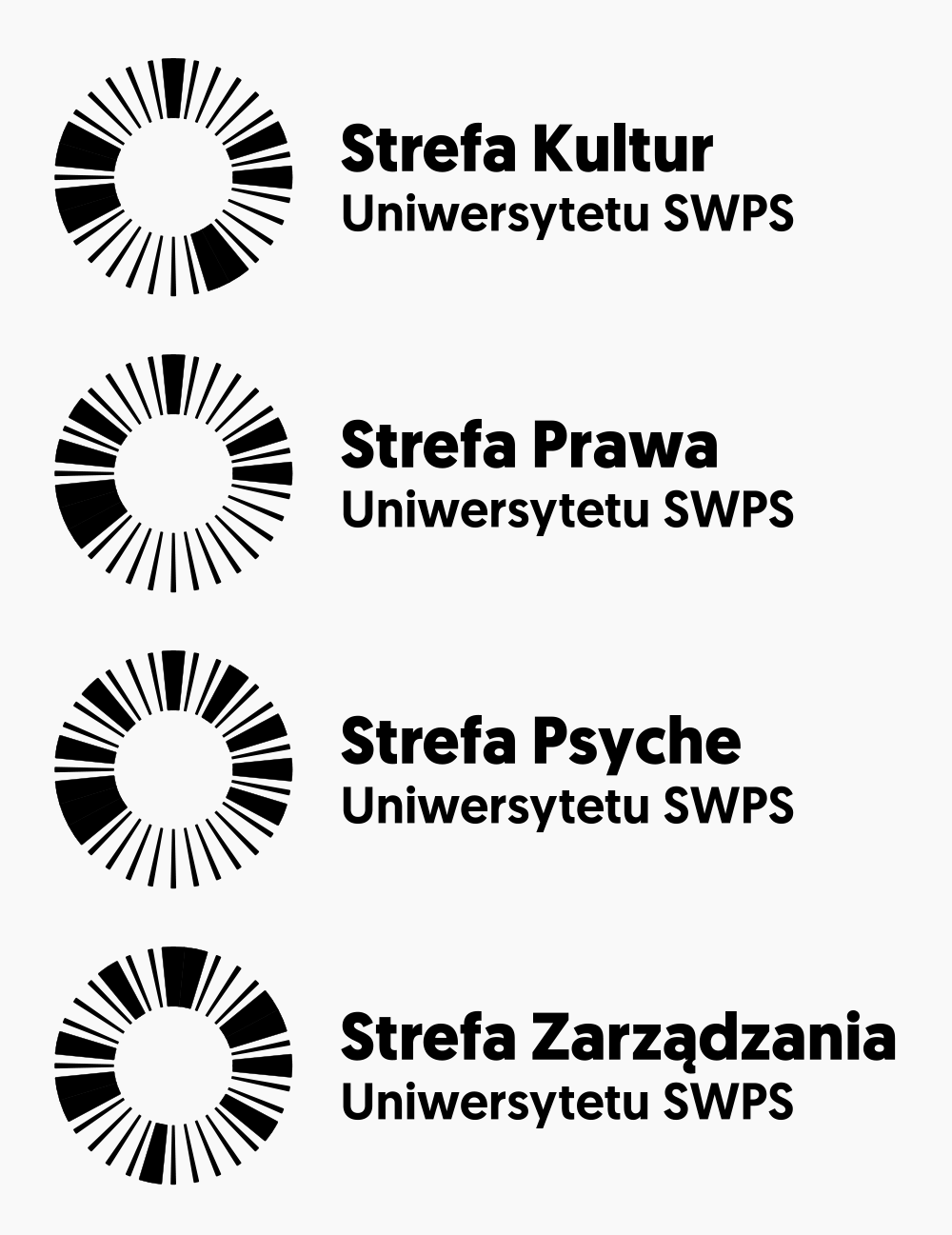 從概念上講,華沙人文社科大學(xué)新校徽的這一創(chuàng)意形式非常有趣。logo本身就是一個(gè)具有高度靈活可變的開放系統(tǒng),根據(jù)學(xué)院組織單位的名稱,圓形的色塊填充位置也會(huì)發(fā)生變化。如下面的四個(gè)系,每個(gè)系的圖標(biāo)都是不同的。這樣的logo充滿記憶點(diǎn),很難不給人留下印象。