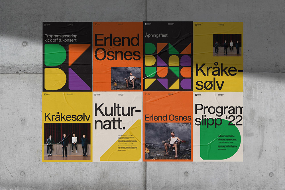 整個品牌形象的核心元素也是這兩種形狀,它們可以自由靈活地基于四格的空間中旋轉變化,以適應所有不同的文化藝術和活動。這種靈活性在調(diào)色板和設計系統(tǒng)中得到延續(xù),為 Beddingen 和 Kulturkollektiv 提供了他們所需的表達自由,在一個定義的系統(tǒng)中,確保兩個身份的外觀和感覺一致。