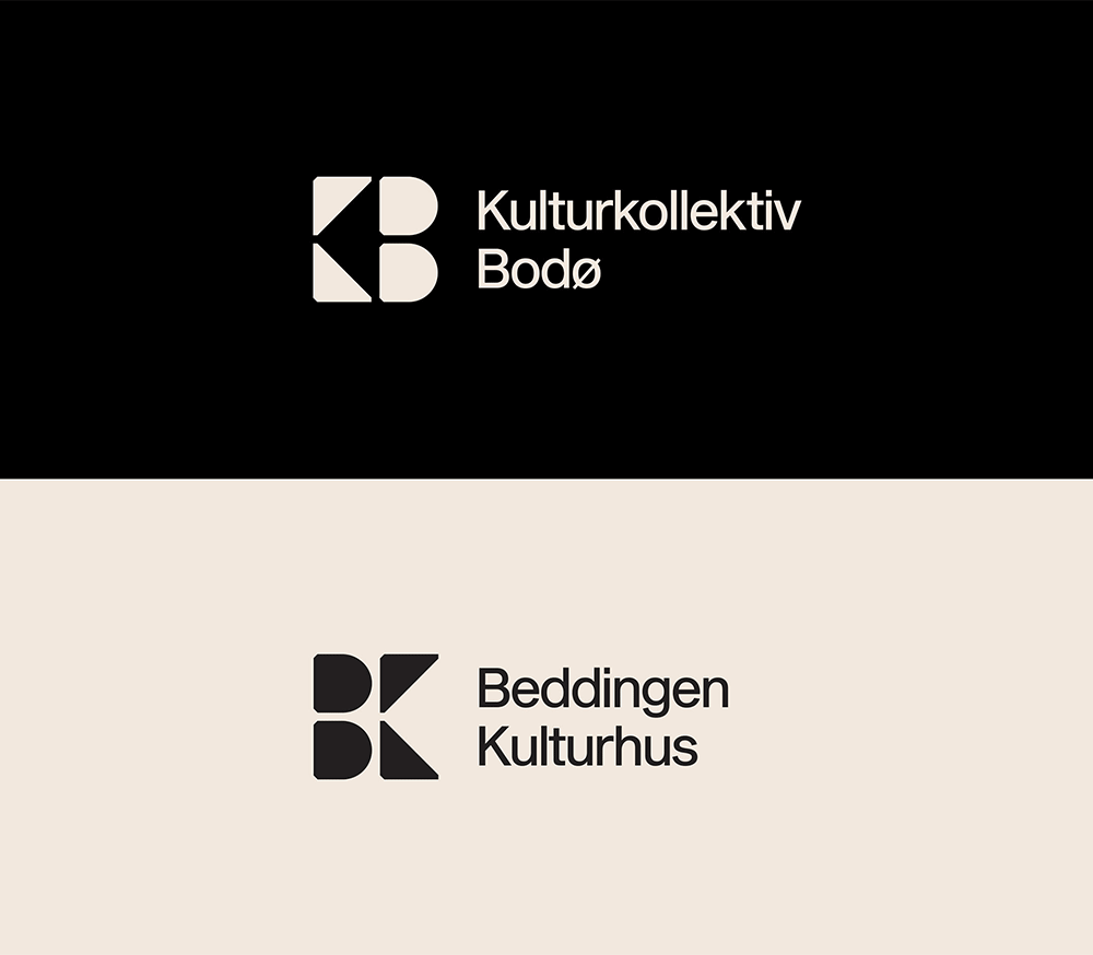 設計團隊提供的解決方案是通過兩個基本形狀(三角形和半圓角矩形)構成抽象的“B”和“K”字母符號。Beddingen kulturhus雖然由Kulturkollektiv Bodø 管理,但它們是兩個實體,因此兩者的LOGO有各自獨特的符號,同時又有明顯視覺關聯(lián)性。