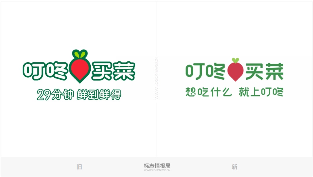 去掉輪廓描邊后,紅蘿卜顯得更加圓潤(rùn)肥碩,兩片綠色的蘿卜纓連接在一起,形成一個(gè)綠色的心形「♥」符號(hào)。品牌口號(hào)也從之前的「29分鐘鮮到鮮得」變更為「想吃什么 就上叮咚」。個(gè)人理解的是,前者強(qiáng)調(diào)高效率的便利購(gòu)物體驗(yàn),后者則囊括了生鮮美食等滿足各類家庭生活所需的產(chǎn)品。