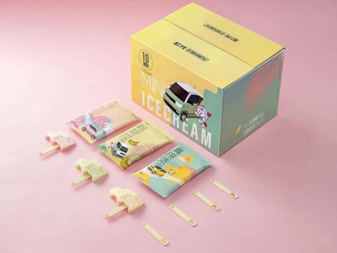 甚至在炎熱的夏天推出了宏光MINIEV馬卡龍雪糕,小清新風(fēng)格的外包裝,以及汽車造型的雪糕,成功地吸引了一波流量。
